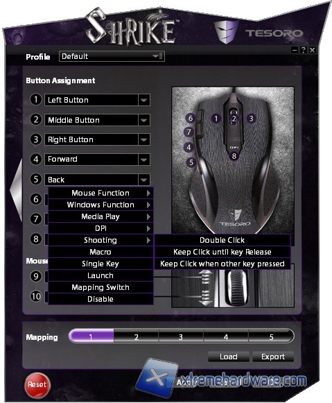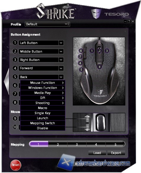 Nel dettaglio, nella schermata principale troviamo l’immagine campione con i numeri dei tasti assegnabili e per giunta un’immagine dedicata per lo Scroll. Non mancano i profili personalizzabili per un totale di 5 i quali potranno essere caricati, esportati e modificati. Dunque, in questo primo menù potremo assegnare una funzione o un tasto ai 10 tasti complessivi presenti sul mouse. Non manca la possibilità di assegnare funzioni multimediali, avvio di programmi, macro e molto altro.