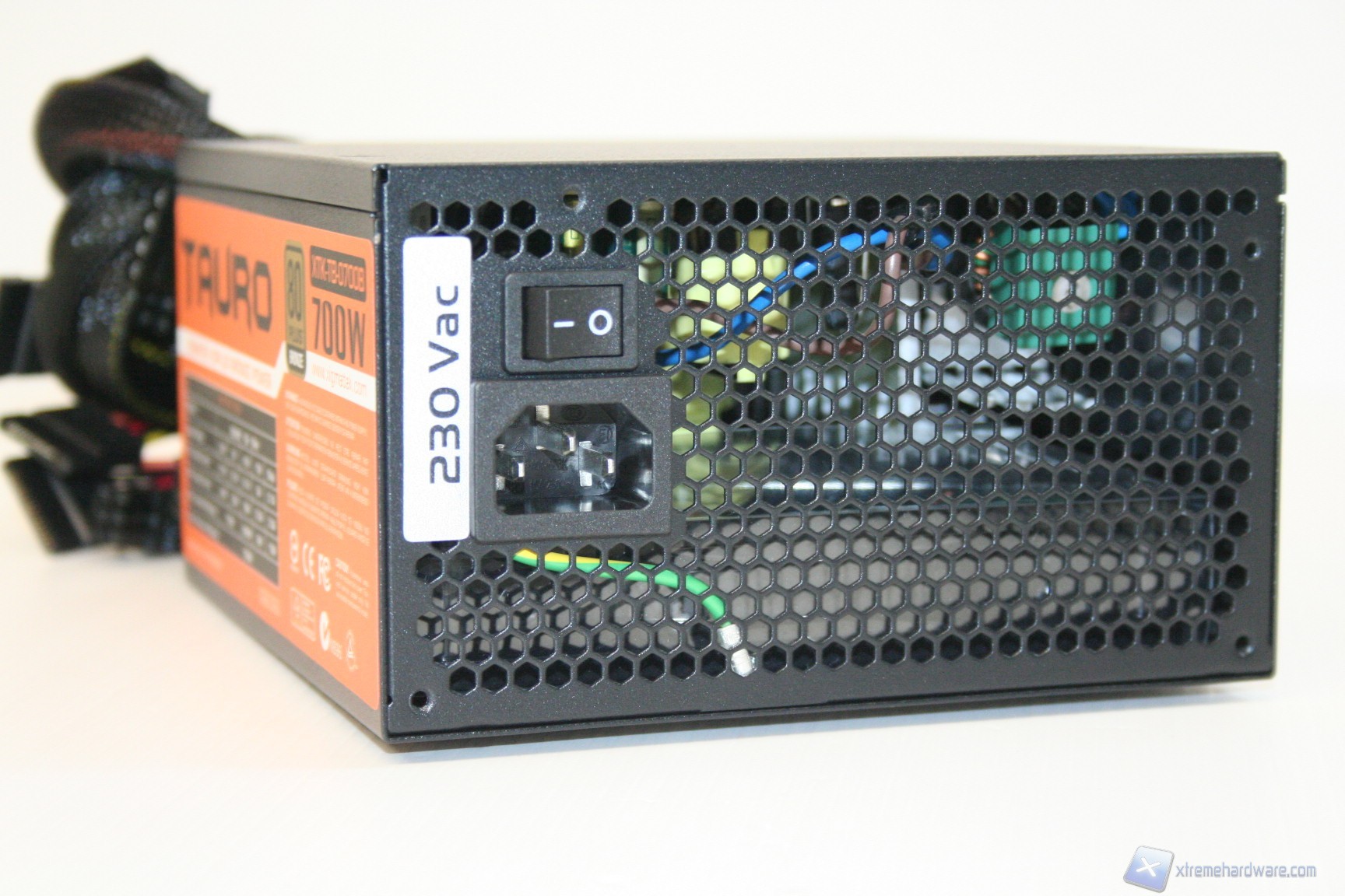 Il design esterno, sebbene presenti un layout standard, è abbastanza vivace, data la colorazione nera con sticker arancioni. La ventola, con una griglia superiore, ha un diametro di 135mm, mentre nella parte anteriore sono posizionati i connettori non modulari dell’unità. Non presenta particolarità degne di menzione in quanto posteriormente ci sono le classiche fessure a nido d’ape, un connettore di alimentazione identico allo standard ed un pulsante di accensione classico, non maggiorato. Gli sticker laterali sono molto carini e presentano un toro stilizzato, che rimanda al nome della serie, assieme alla certificazione Ecova. Avremmo apprezzato di più se lo sticker con le specifiche fosse stato messo sulla destra, in modo da permetterne la visualizzazione una volta montato nel cabinet. Ad ogni modo, una volta acquistato, si presume che si conoscano già le specifiche tecniche.. L’alimentatore inoltre è stato pretestato con il test di massa “HI POT” e “QC” ed il test in questo caso risale a maggio 2012. Nella parte superiore possiamo trovare il seriale, anteriormente però. La verniciatura è buona e non sono presenti sbavature od imperfezioni.