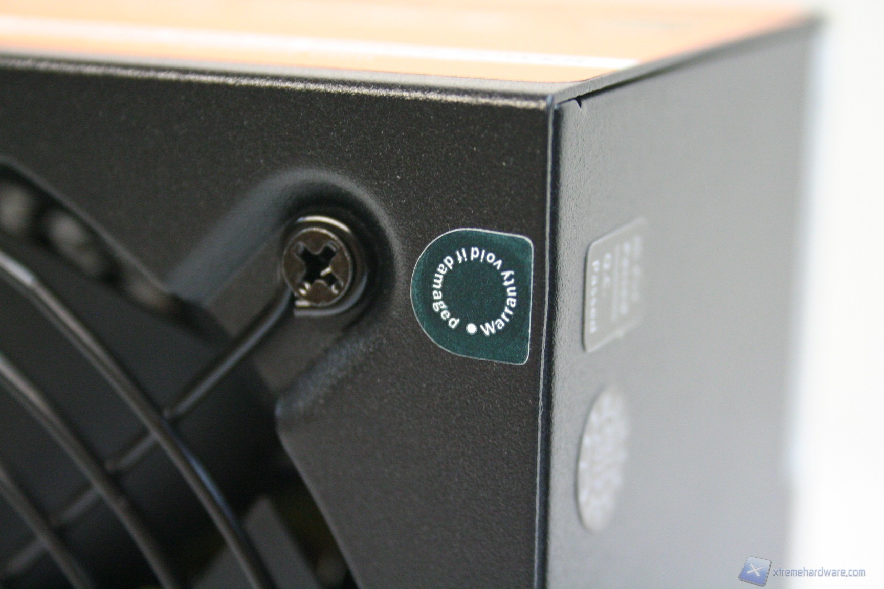 Lateralmente, in alto, c’è uno sticker che segnala la perdita della garanzia della casa produttrice qualora dovesse essere rimosso o forato, per permettere lo smontaggio della scocca, cosa presente nella quasi totalità degli alimentatori attualmente in commercio.